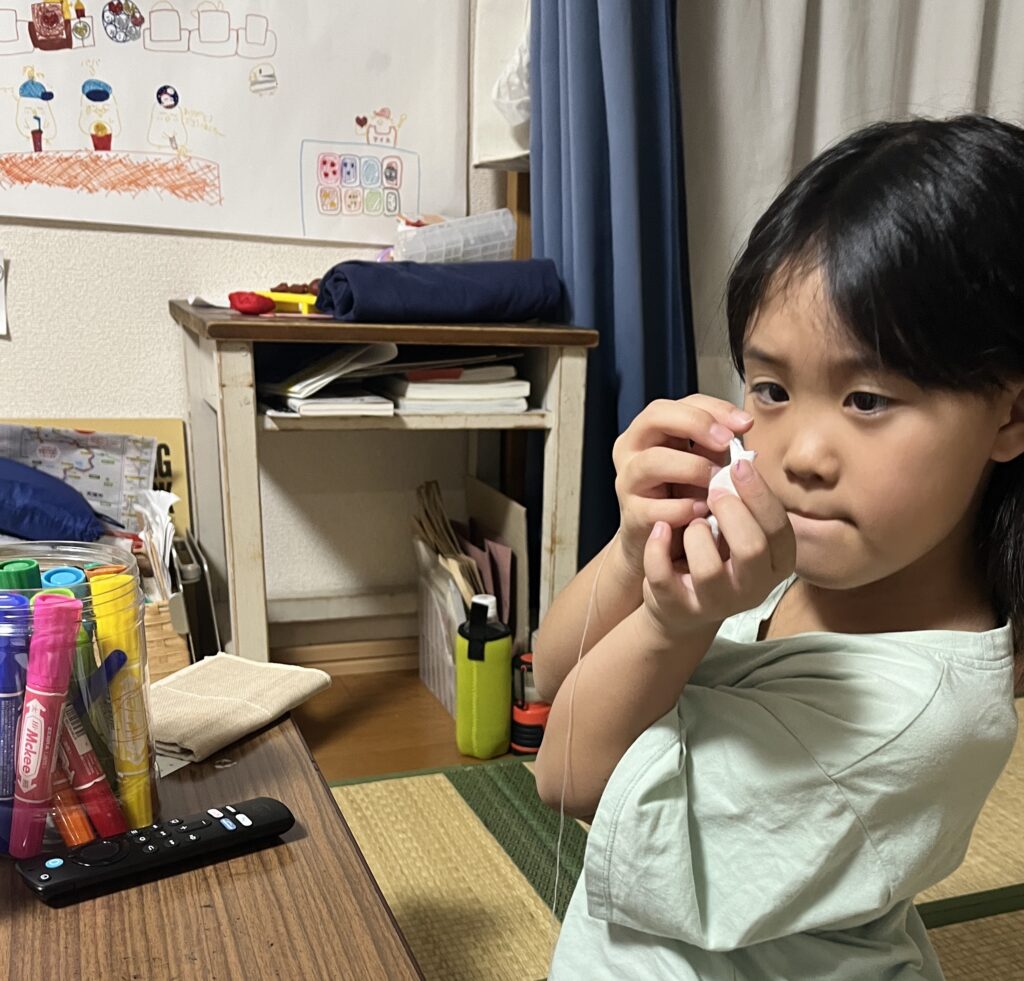 一緒に(ママは髪留めを)机でちくちく縫う時間は、
