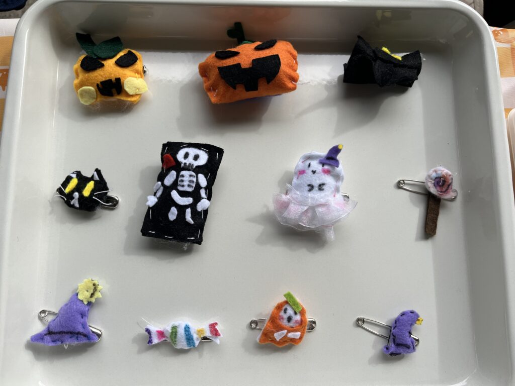 準備万端!左があかりのバッチ。右が私が作った髪留め。